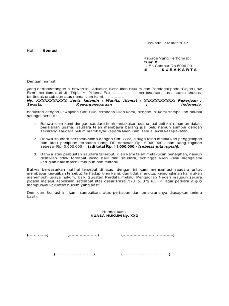 Surat somasi bisa dikatakan mirip dengan surat teguran atau bisa juga sebuah peringatan, yang diberikan untuk pihak tertentu yang dinyatakan melanggar hukum dan peraturan. Surat kuasa di pengadilan negeri. Jalan mawar belimbing nomor 4 semarang. Melakukan pembayaran harga barang kepada kami sebesar rp. Surat kuasa di pengadilan agama.
